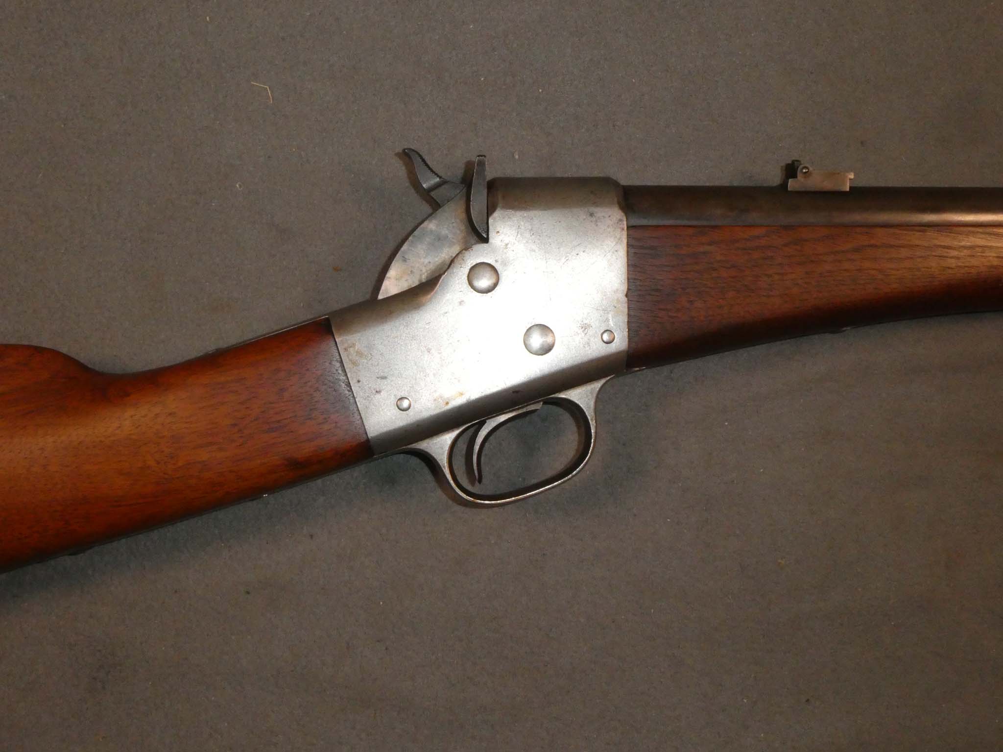 Here is an original Remington Type II "Split Breech" Breech Loading Carbine chambered for the .50 rimfire cartridge. The "Split Breech" Remington was the predecessor of the later "Rolling Block" rifles. It was the first Remington arm chambered for a metallic cartridge, and the last type arm supplied on contract to the Union Army before the war ended. Production of the carbine was sub-contracted to the Savage Revolving Arms Co. of Middletown, Connecticut. About 15,000 of the Type II were produced. Remington bought nearly all of these carbines back from the Government in 1870 and sold them to France for use in the Franco-Prussian War. This carbine is in very good condition. The barrel has a smooth dark brown patina with some blue in protected areas. The receiver and trigger guard have no finish remaining with a steel patina. The butt plate has a Steel patina with some brown speckling. The gun has excellent mechanics and a very fine bore. There are a few tiny specks in the bore, but it is mostly shiny with strong rifling. The stock is very fine with just a tiny ding or two from use. This is a nice example of a scarce Civil War carbine. Stock no. 31156