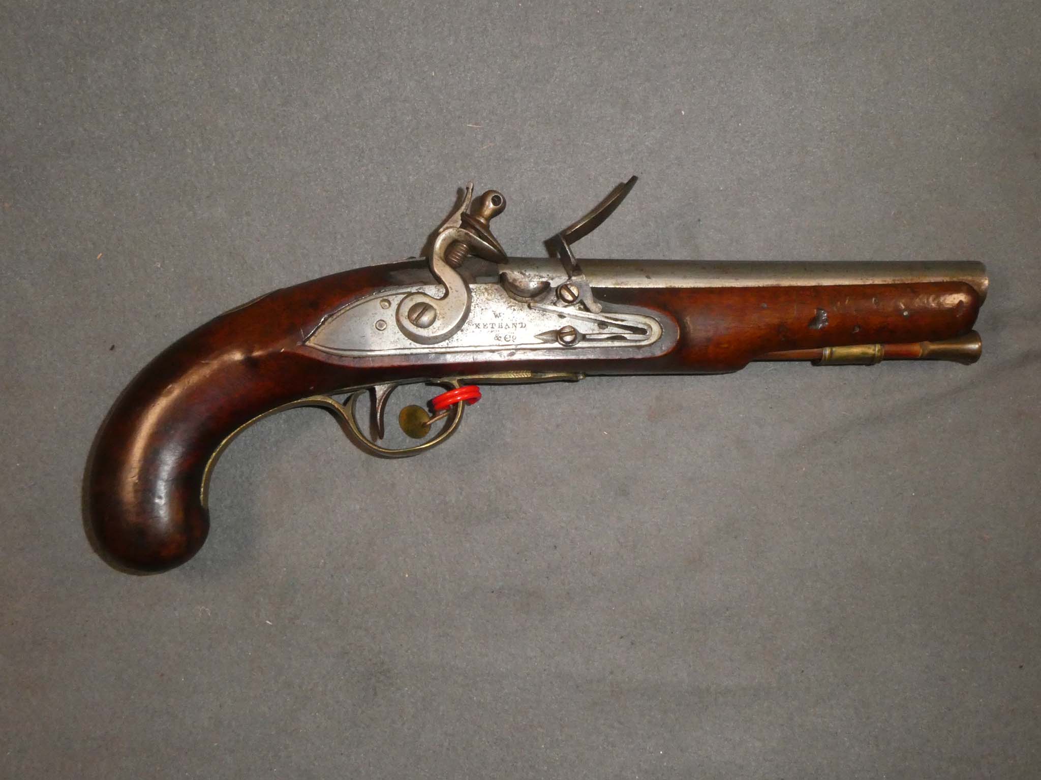 This is an original, British Flintlock Trade pistol made by T. Ketland of London, England dating to the first quarter of the 19th century. This is a medium-sized pistol with a 7-inch barrel. Pistols like this were common trade items in the North American fur trade. This pistol is in fine condition with an overall steel patina. Some brown is developing on the barrel around the breech. There are some dark speckles on the lock. The brass has a nice golden brass patina. The lock will cock and fire, but there is no half cock notch. It is an earlier lock with no roller on the frizzen. The bore is dark with some rust, particularly on the face of the breech plug. Most of the bore is smooth. The stock is very fine with a few dings and scratches from use. There was an old collection number taped to the left flat of the stock and a couple of tape fragments remain. The initials "WP" are stamped on the left flat, as well. The pistol has a thumb piece but no butt cap. This is a very nice example of an English trade pistol. Stock no. 31175
