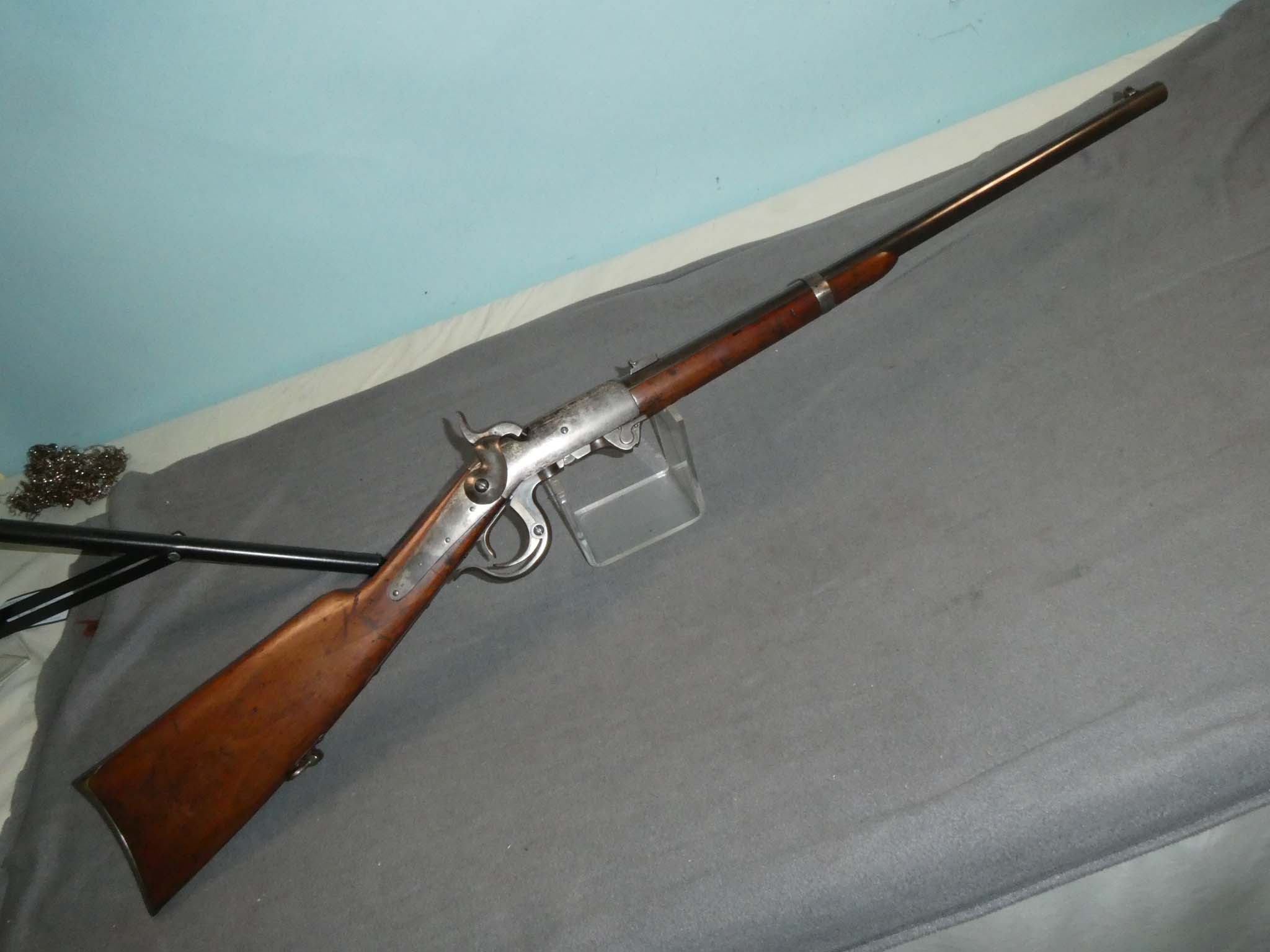 Here is an original, Civil War 5th Model Burnside Cavalry Carbine manufactured by the Burnside Rifle Company of Providence, Rhode Island. This carbine was designed by Union General Ambrose E. Burnside prior to the war. The Burnside was the 3rd most used carbine of the Civil War, behind the Sharps and the Spencer. It was a .54 caliber, lever action, single shot, breech loader that used a tapered metallic cartridge. The 5th Model Burnside was the version produced and issued in the largest numbers, with about 43,000 produced from 1863-1865. Cavalry Regiments known to have used the Burnside were the 1st Michigan, the 3rd Indiana, the 5th, 6th, and 7th Ohio, the 1st New Jersey, the 3rd West Virginia, the 3rd, 14th, and 18th Pennsylvania, and the 2nd, 12th, 14th, and 16th Illinois. This carbine is in very good condition with about 90% of the blued finish remaining on the barrel. The receiver, lever mechanism, and butt have a steel patina with a liberal speckling of brown. The mechanics are excellent. The bore is very fine to excellent, bright and shiny, with strong rifling. The stock is in good condition with a scattering of small dings, scratches, and gouges from use. There are two strong inspector's cartouches on the left side of the wrist. Small initials, "J S W" are carved on the belly of the butt stock. This is a good example of a Civil war Burnside. Stock no. 31500