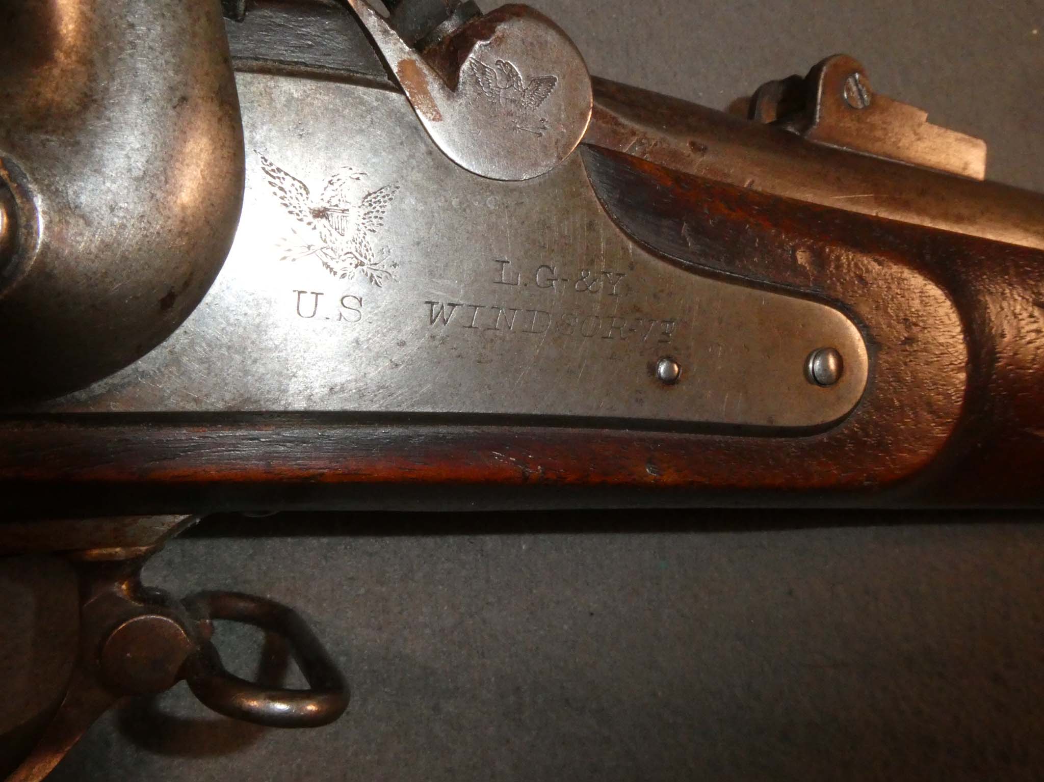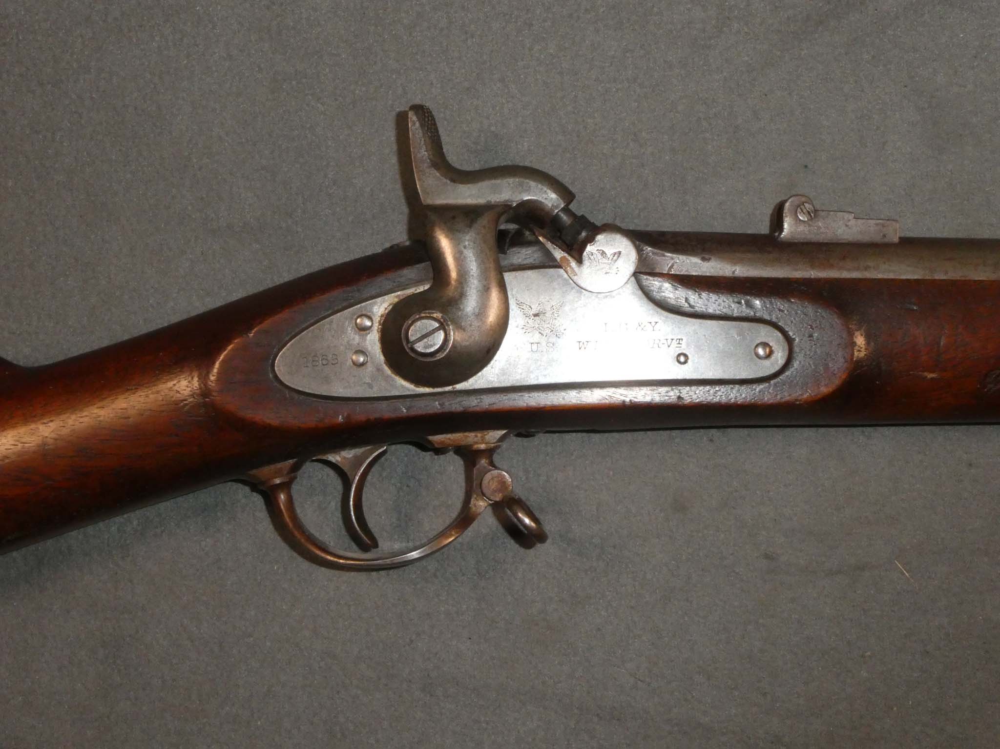 This is a .58 Caliber percussion US Model 1861 "Special" Rifle Musket produced by Lamson, Goodnow, & Yale Company of Windsor, Vermont. Colt's Patent Firearms Manufacturing was the lead design on the M1861 Special Model Rifle Muskets. These Enfield-like pieces were built on Robbins and Lawrence Enfield Machinery and incorporated many of the better features of these British arms. Differences from the standard Model 1861 rifle musket included a wedge shaped, stronger hammer, straight ramrods with stock spoon, and screw bands with no band springs. The clean out screw on the bolster was eliminated. These changes led directly to the improvements incorporated in the M1863 Springfield Rifle Muskets. Along with Colt, these were made by Amoskeag Manufacturing Company and Lamson, Goodnow, & Yale Company. This musket is in very good condition. It has an overall steel gray patina with some mottled brown. There is some light pitting around the bolster. The mechanics are excellent. The bore has some light pitting in places, but the rifling remains strongly visible along the barrel's length. This is one larger pit about 1/3 down the barrel. The stock is very good with a scattering of small dings, dents, and scratches from use. There are two visible inspector's cartouches on the left flat of the stock. The ramrod may be a replica. Stock no. 32128