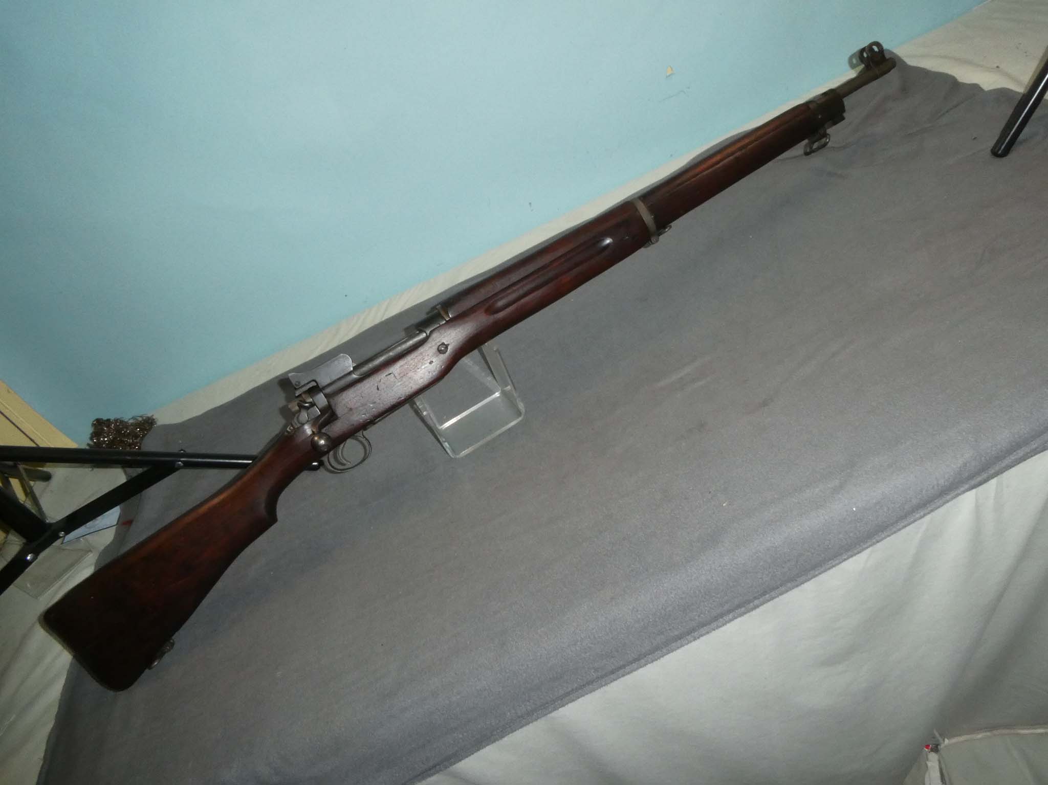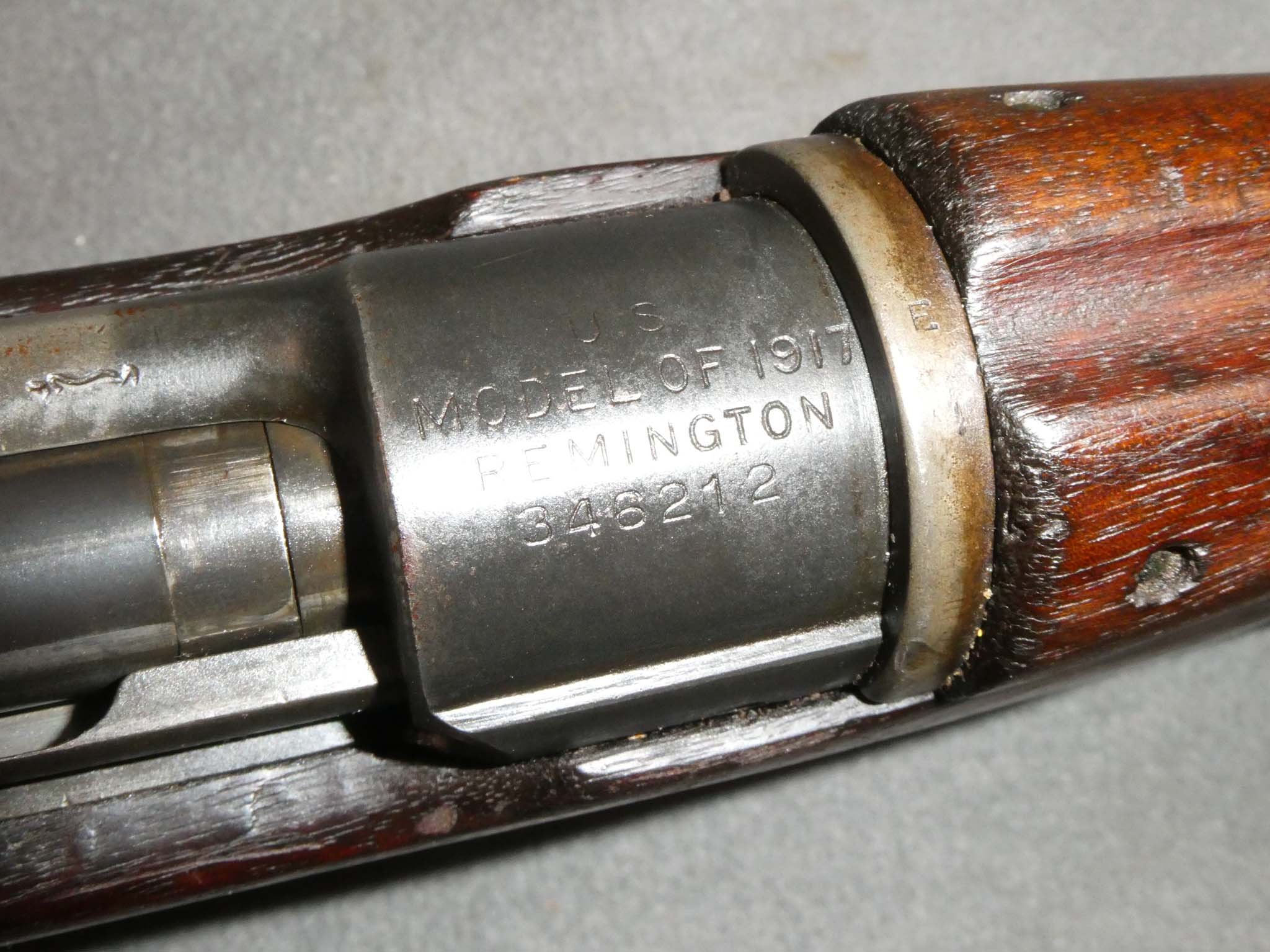 This is an original, WWI, U.S. Model 1917 Rifle produced by Remington in 1918. The U.S. Model 1917 was based on the British P-14 Rifle being produced under contract by Winchester, Remington, and Eddystone. The British contracts ended just as America entered WWI. Rather than retool to make the Model 1903, it was decided to alter the P-14 to accept the U.S. .30-06 Government cartridge and the M1917 Rifle was born. Over 2.5 million were produced before the war's end. The M1917 actually saw more service in the war than the '03 Springfield. Alvin York won his Congressional Medal of Honor with a Model 1917 Rifle. This rifle was rebuilt for service in WWII where it was given a new barrel by Johnson Automatics. This rifle is in fine condition with more than 90% of its blued and parkerized finishes remaining. There is some finish wear on exposed edges, bolt handle knob, and butt plate. The bore and mechanics are excellent. The stock is very good with a scattering of small dings and scratches consistent with use. This is a good example of the Model 1917 as used in WWII. Stock no. 32227