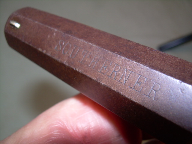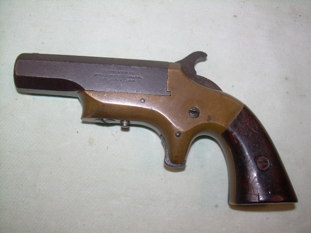 This is an original antique "SOUTHERNER" Deringer made by the Brown Manufacturing Company of Newburyport, Massachusetts. These were produced from 1866 to 1873. This was a single shot deringer with a pivoting octagonal barrel chambered for the .41 Rimfire cartridge. Most had blued barrels with silver plated frames. This deringer is in very good condition. The barrel, hammer, and trigger have a smooth dark brown patina. No silver remains on the frame which has weathered to a beautiful dark bronze patina. The action works well. The bore is good with some rust, but visible rifling. The rosewood grips are very good with some wear of the varnished finish and a few tiny dings from use. Only about 6,500 of these little deringers were made. Stock no. 28702